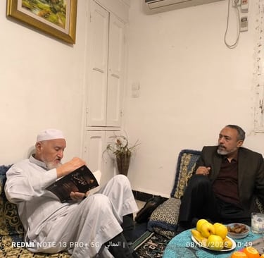 وهذا المكان يشهد (أي صالون الدكتور في الأبيار) كان يجلس من هنا الشيخ عدون، ومن هنا الشيخ حمو فخار، ومن هنا الشيخ إبراهيم القرادي... ونحن طور تأسيس التراث... والتراث كانت من تأسيس هؤلاء رحمهم الله؛ نعم، لقد دعوتُ أنا للتراث فاستجاب المشايخ رحمهم الله، بكل طواعية وبكل تواضع، وحملوا الهمَّ، وشاركوا في حمل العبء،